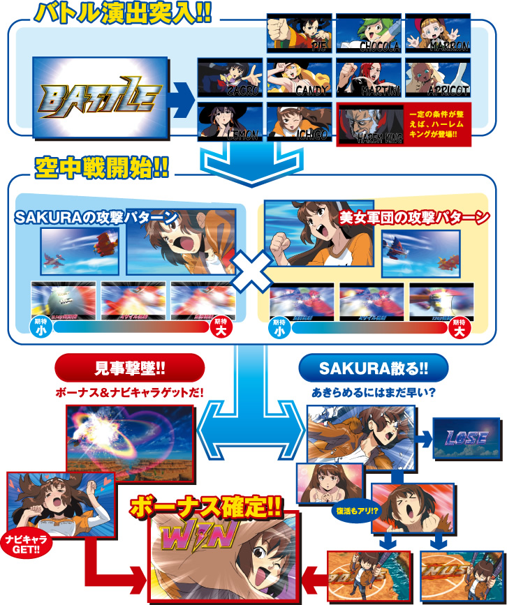 残念… パラシュート演出に発展 無事着地すれば… 通常画面(地上ステージ)へ最大3ゲームにわたる壮絶な空中戦。攻撃をかわし、敵機撃墜でボーナスだ!