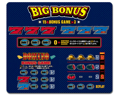 「LUCKY TIME」については詳しく本編で紹介いたしますが、ドミノLTでは、ビッグボーナス終了後100ゲームは、リプレイの当選確率が大幅にアップし、ほとんどコインを減らさずプレイすることができ、その間に次のビッグボーナスへの期待が大きく膨らみます。