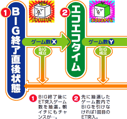 BIG終了および天井到達時、次の天井到達(=ET突入)のチャンスは375〜725Gの間で8段階存在。